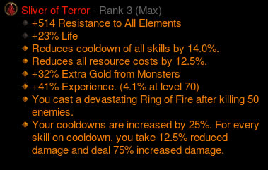 第一枚是只能镶嵌在头部的,代表迪亚波罗的恐惧碎片,它的基础效果是【你的技能冷却延长25%。但每一个冷却中的技能都会为你提供12.5的减伤和75%的增伤】