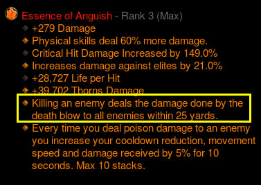 它的三级特效有三个,但所有人都只会选择【击杀敌人时对25码内的敌人发动致命一击】的效果,这一效果类似死灵的尸爆,但伤害远远超出,就算是150的大秘境守卫挨上两下也会立刻暴毙。