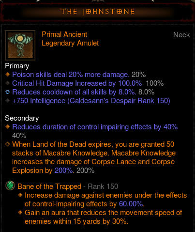 技能符文为毒骨甲、毒虹吸、毒尸爆(近战毒符文)、聚怪大军(死亡之谷)、冰死地、18斩诅咒。被动为:孤魂死灵,绝命效忠,亡魂灌注,鲜血之力,弱点加深(无形带的被动)