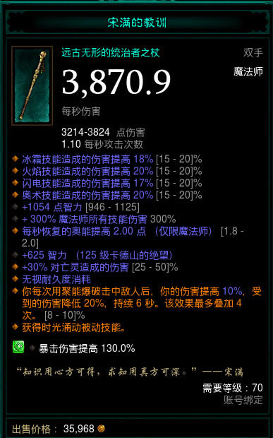 无形武器必选宋满的教训,这一武器300%增伤是一拖三法师的核心竞争力,传奇特效可以是深渊(上图)也可以是绝命(引导增伤)。