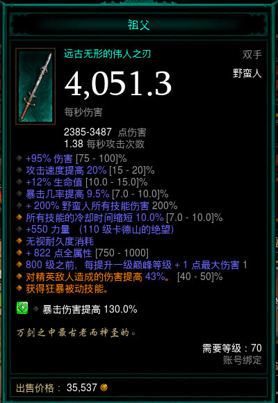 野蛮人在24赛季中获得的三把武器里,祖父最契合痛风玩法,和单手武器相比高额的白字以及200%的增伤是在太香,所以绝大部分野蛮人都选择了这把武器作为主武器,另外两把武器只有在狂乱之类极其需求攻速的BD中才可以看见了。