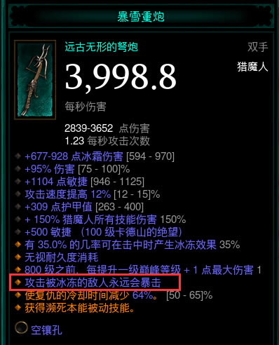 只有拥有重炮的猎魔人才有资格打输出,这一无形装备独特的冰冻必爆词条可以被队友触发,让输出猎魔人省下大量爆击词缀来追求冷却、坚韧和范围伤。