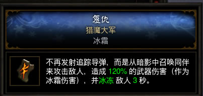 猎魔大军符文特效可以让辅助DH冻住怪物,所以尽量跑在队伍前方,在输出就位之前冻住怪物且挂上缠绕。辅助dh装备词缀同样以冷缩为主,保证无缝复仇即可,未来需要经验组件可以根据情况上地狱火戒指、凯恩等。