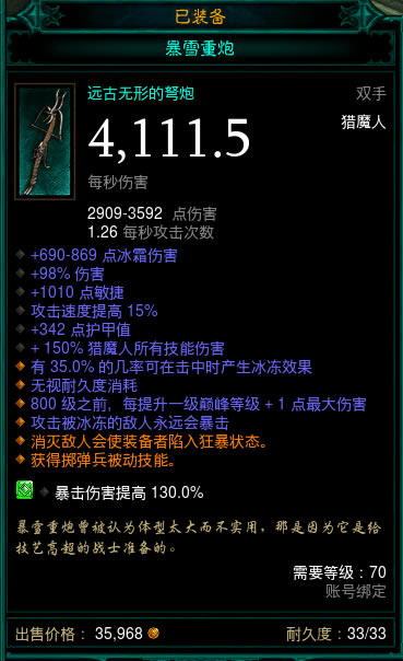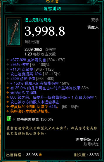 不过考虑到速刷秒白怪和击杀霸王需求,爆击几率最好还是维持在50%左右,不要低于40%,也就是说最多双戒指不出爆击,其余部位还是要正常出爆击的,项链前期可以用冰伤暴伤敏捷版本,后期还是要双暴冰伤。