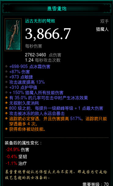 由于暴雪重炮自带了35%冰冻和(对冰冻的敌人永远暴击)词条,以及高额的白字,戒指部位的均伤和暴击受益变低,在赛季前期,首饰位置的词缀需求为暴伤>冷却/范围>均伤>暴率>主属性,极端情况下你甚至可以用只有暴伤的戒指。