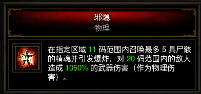 传奇特效:当尸骸精魂引爆时如果击中至少一个敌人,你的邪爆造成的伤害会提高 (150-200)% ,持续6秒,最多叠加5层。