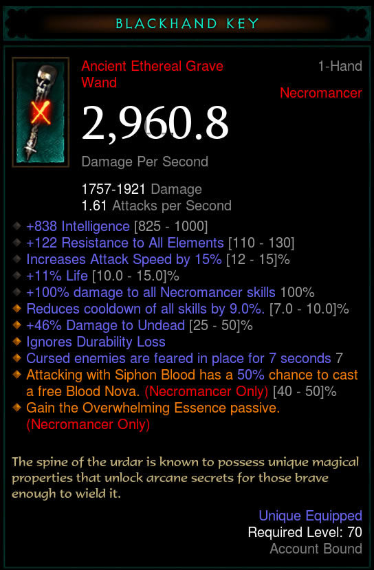 传奇特效:骨矛现在消耗40点精魂并提高(550-700)%的伤害。