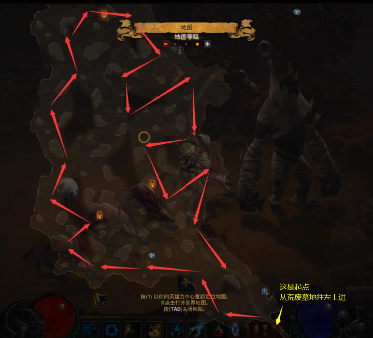 苦难旷野的走法如上图所示,注意使用链击攻击远处的怪物,有了跑马技能后利用它把两个怪堆连接起来,尽量打出数量高的连杀。