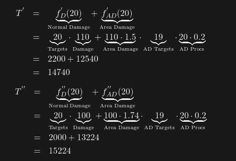也就是目标数量为10的时候,带范围伤的第二把将超过第一把。单体目标时比如击杀boss时,第一把此时优于第二把,收益x ≈ 1.1139。