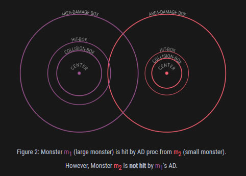 图中M1命中区域比M2大很多。当你击中M1时,范围伤无法作用到M2目标;而击中M2时,范围伤可以作用到第二目标M1。