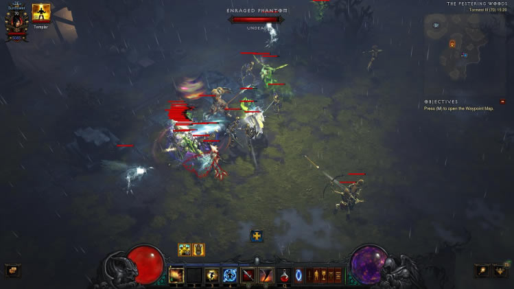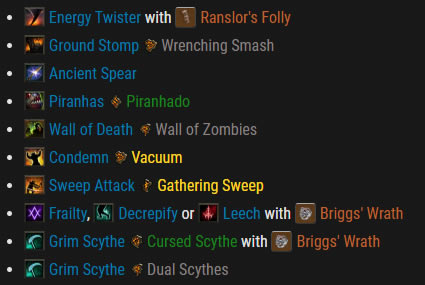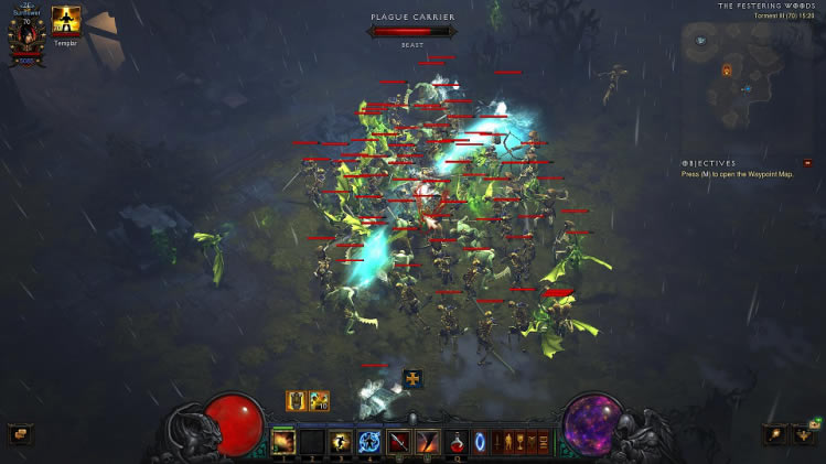 上面图中,法师在使用能量气旋配合郎斯洛的愚行护腕后的效果,大面积的怪物被拉拽到一个极小的区域,此时范围伤效果爆炸。并不是所有可造成位移技能都有这个效果,比如武僧的飓风破,可以聚怪但不会触发怪物碰撞体积消失。