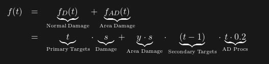 假设你使用AOE技能比如能量气旋击中t个目标(理想模型:互相都在10码范围内),角色装备y范围伤,能量气旋造成s伤害。