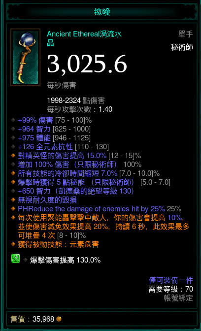额外的精英伤害、爆击回能、冷却缩减还有独立的法师技能增伤,种种因素令眼球成为了魔法师冲层前期的选择,PTR第二版中新增的减少怪物伤害词缀让魔法师即使是3000巅峰在150也不需要带上太多的减伤被动。