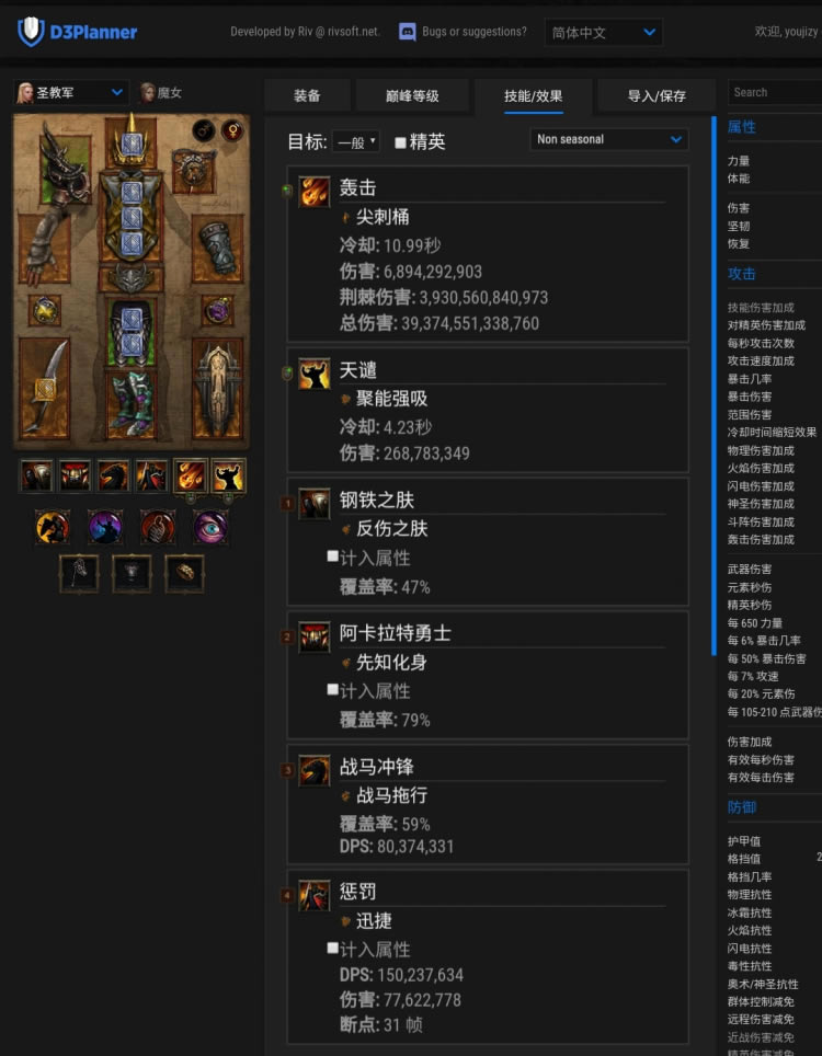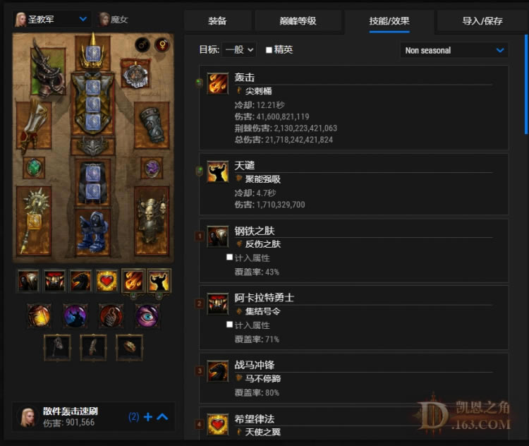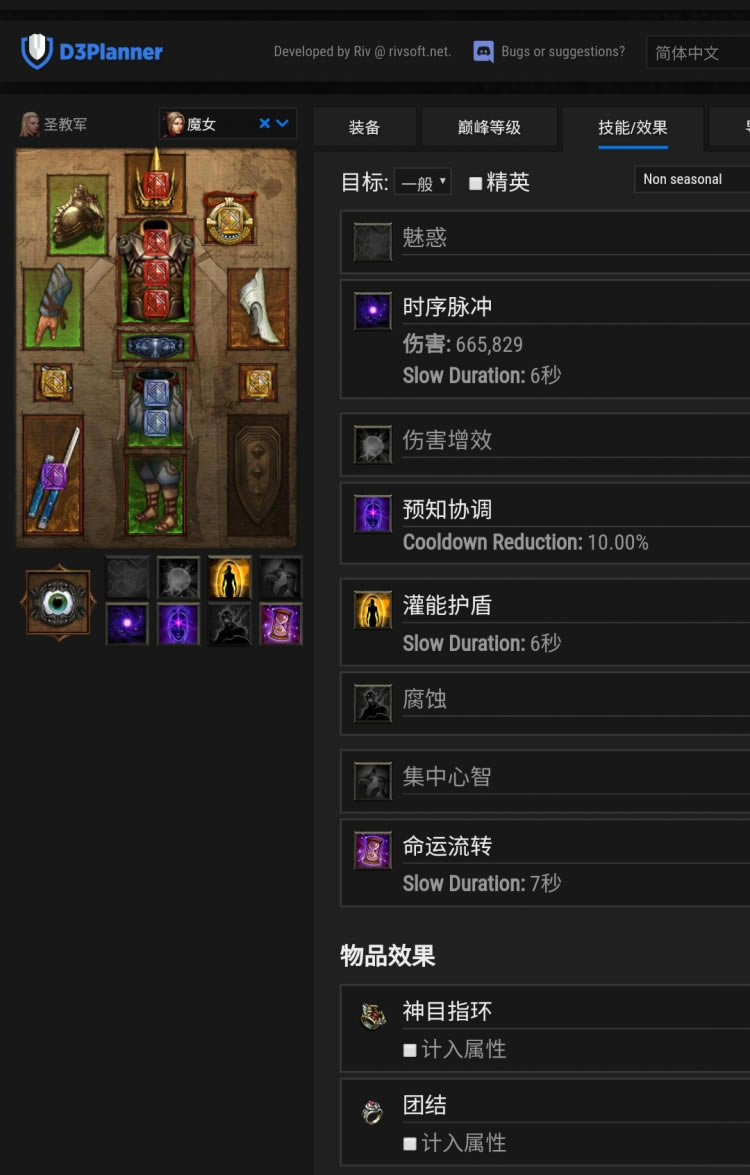 上图是带不死圣物的,所以装备词缀和宝石不用参考,随意来。有条件的身上镶黄宝石,远古装备打卡,智力堆到2.5w,然后打力量/敏捷卡堆护甲,装备免死,毁伤,转煞宝石,随从可以在5分钟左右完成的120+层站住,这时可以带全技能圣物。