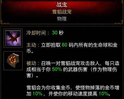 0.技能需要点出雪貂战宠10%的金币加成(实测发现机制相当于装备上的金币加成词缀)。
