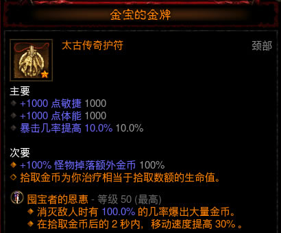 3.颈部金宝的金牌镶嵌囤宝者的恩惠,特效捡钱加血,其金币加成词缀的范围75-100也区别于其他项链71-80。