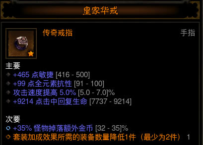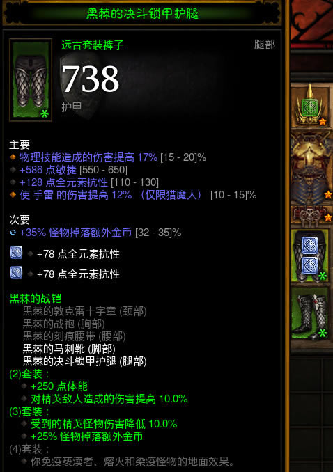 9.左戒与腿脚,选择黑棘两件套加皇家华戒,触发三件套特效的金币加成。