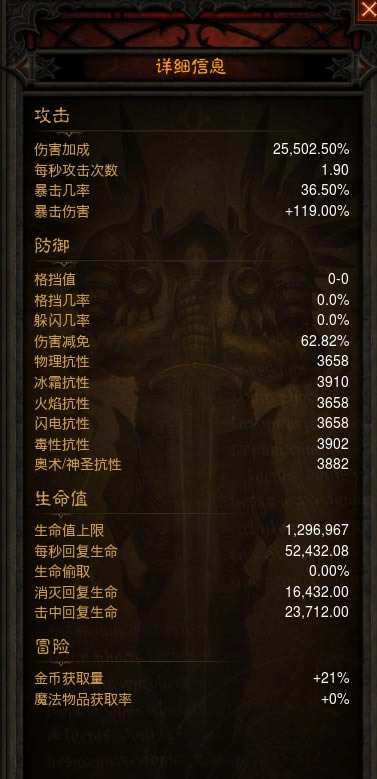 第四,在满足25,000智力前提下,随从装备尽量出暴击和攻速,可以进一步触发增痛,我的魔女面板堆了36.5%的暴击率
