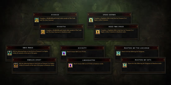 征服成就这一方面,我们也在不断轮换!喜欢用最快地速度积攒金币?守财奴和吝啬鬼就是你的挑战。想在斩妖除魔的同时体验速度与激情吗?速度之魔和极品飞车就是你的目标。想要在体验速度与激情的同时铲除魔头吗?首领模式和天壤之别正是你的首选。如果挑战大秘境更适合你,有如神助和狮心虎胆将会为你转身。最后,如果你热衷于证明自己对各类职业套装的娴熟驾驭,那么宇宙洞察者和套装精通者也都将回归。