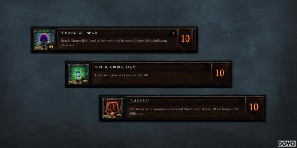 第三季依旧有成就等著大家,除了大家喜爱的“拔腿快跑/急速狂飙”与“贪得无厌/贪财图利”之外,我们还增加几个新成就。举例来说,“宝景良辰”需要玩家把六枚传奇宝石升到40级;“诅咒!”则是要在等级70级到苦痛VI,在诅咒宝箱事件中杀死超过300只怪物。至于先前赛季的成就,大家可以在天梯榜查询自己与他人的成绩。