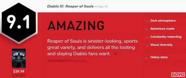 通过“夺魂之镰”资料片和最近的一系列升级补丁,暴雪把《暗黑破坏神3》转变成了一款系列铁杆玩家一直以来所期待的游戏。游戏仍然令人厌恶的需要随时在线,但是游戏具有更加黑暗邪恶的基调,游戏体验也更加的有成就感,也更加前所未有的令人着迷。我非常期待花费大量时间来寻找我所向往的那件完美的史诗装备。