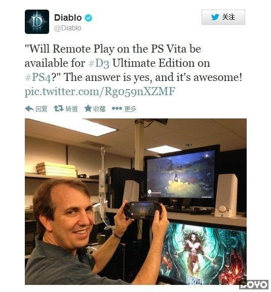 今天,《暗黑》官方Twitter晒出新照,演示者所持PS Vita屏幕中显示的正是《暗黑3》游戏画面,这证明该游戏的PS4版本已经具备了与PS