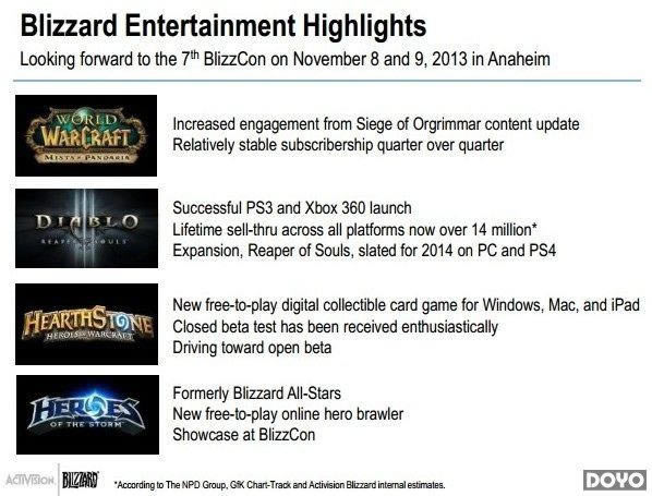 11月7日,暴雪公布了2013年第三季度财报,同时也侧面说明了旗下几款主要游戏的最新状况。比如近日才在家用主机上推出的《暗黑破坏神3》销售状况良好,全平台销售量已突破1400万套,同时更将在2014年于PC/PS4上推出资料片《死神之镰》。另外,《魔兽世界》5.4改版“决战奥格玛”反应良好,有效遏止了玩家的继续流失。而其他几款作品如《炉石传说》、《风暴英雄》(Heroes of the Storm)等也有相关消息露出。