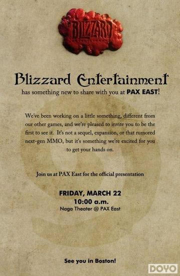 日期国内各大媒体都陆续收到了暴雪的PAX展会邀请函。而PAX展会将在下个月也就是3月22日于美国波士顿开展,暴雪在邀请函中提到他们会在展会中公布一款全新的游戏。