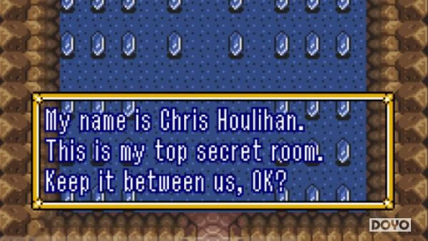 有几种方法可以进入这个房间,最流行的方法就是使用珀加索斯之靴从神殿一路冲到地下通道,如果处理得当,林克会进入一个地下房间,并会收到一条信息,上面写着:“我的名字叫Chris Houlihan,这是我的秘密房间,别告诉别人,好吗?”