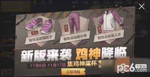 活动介绍:全新版本强势来袭!活动期间收集鸡神奖杯,可兑换永久粉色运动套装。