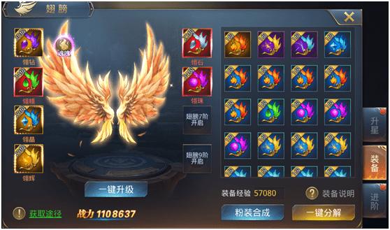 人物等级达到260级可开启翅膀装备系统。共可装备8件翅膀装备,分白、绿、蓝、紫、橙、红、粉品质,分解不需要的翅膀装备可获得经验用以升级装备,翅膀装备栏根据翅膀进阶等级开放,翅膀9阶时开放所有翅膀装备栏。