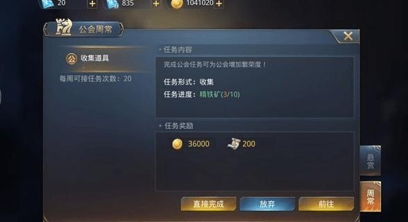 工会周常任务每周共70环,每日不限制完成次数。每一环完成后将会获得大量金币和公户贡献度。因为每周环数是固定的