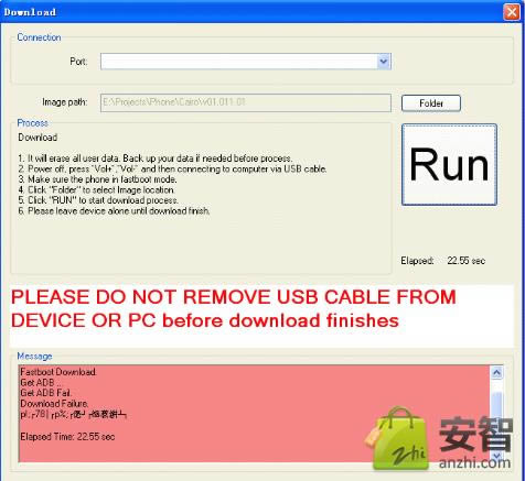 3..手机关机,按住音量上下键直至手机进入刷机模式,有几条蓝色字母的就是了,然后接上数据线