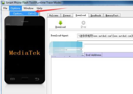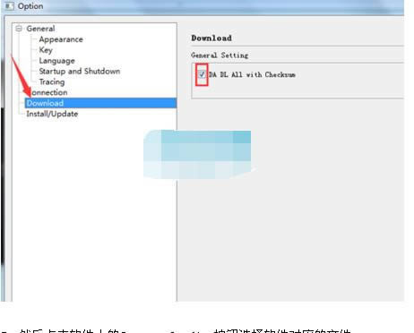4:然后点击【Option】->【Option】->【download】,然后勾选”DA DL All With Check Sum”,检查name处,要打钩: