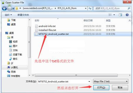 6:然后在刚才解压出来的固件文件夹中的文件夹里选择【MT6752_Android_scatter.txt】