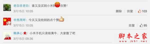 3月15日小米5售罄之后官微下方的网友热门评论